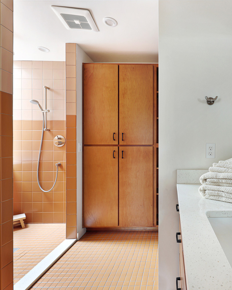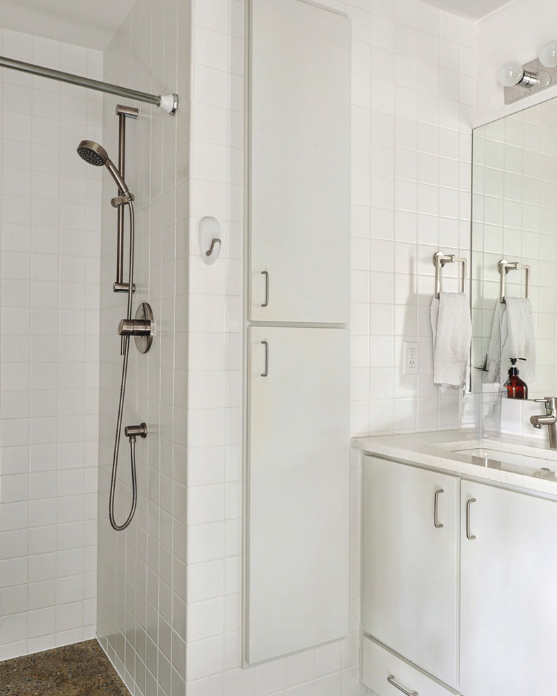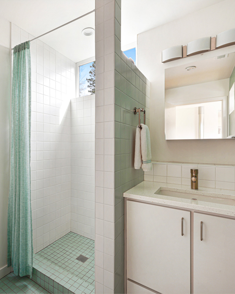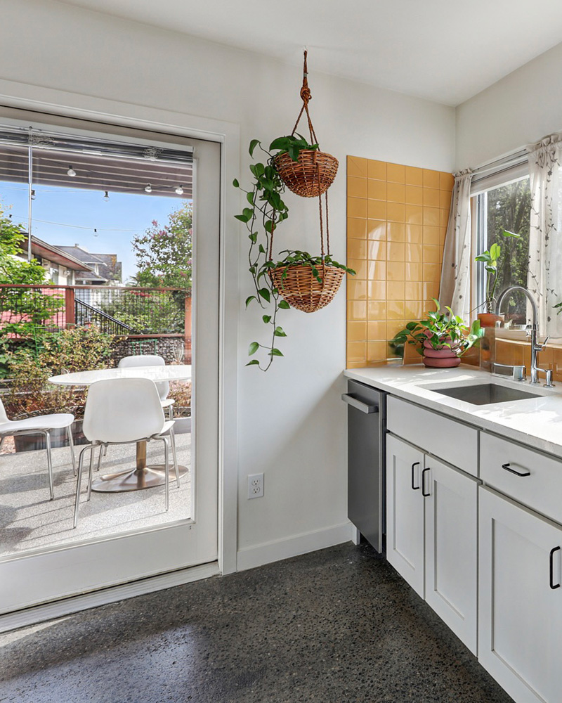 The lower-level accessory dwelling is ideal for extended living or long or short term rental and can be accessed through both a separate entrance and the upper level. The generously composed space maintains the same sense of light and airiness found above. A galley kitchen with clean white cabinetry and cheerful tilework is anchored by a glass door that brings in natural light and provides access to a private, outdoor patio. Neutral concrete floors run throughout, while the living and dining area are enhanced by a built-in window seat that offers a quiet place to take in views of the garden and also features additional storage. The bedroom is generously sized, and the three-quarter bath features a walk-in shower and integrated storage, finished in crisp white tile. An in unit washer and dryer adds everyday convenience.