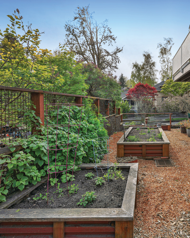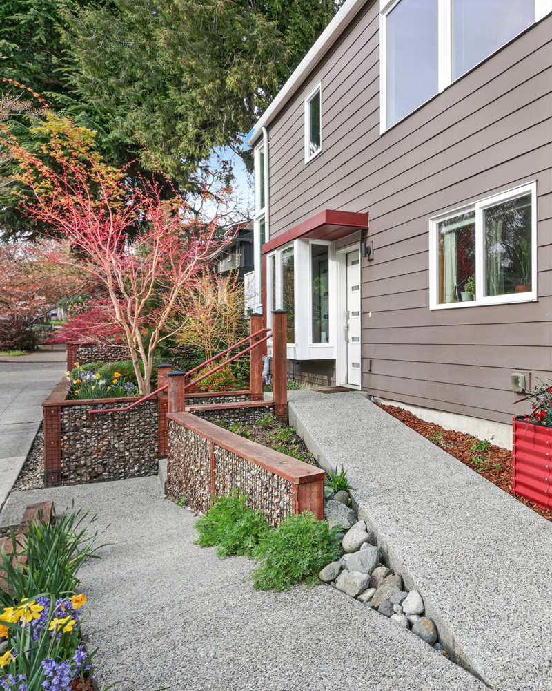 Outdoors, the property is enclosed by a gabion wall—constructed of stone and steel mesh—wrapping the home in a boundary that feels both architectural and organic. The effect is one of privacy without heaviness, allowing light and air to pass through while remaining in quiet dialogue with the surrounding landscape. The yard is designed for low-maintenance living, with wood chip ground cover and raised garden beds that offer space for planting while preserving the home’s clean, natural aesthetic. An attached garage with additional storage room offers space for parking and organization. A thoughtful and contemporary compound reflective of a modern, in-city lifestyle in one of Seattle’s best residential neighborhoods.