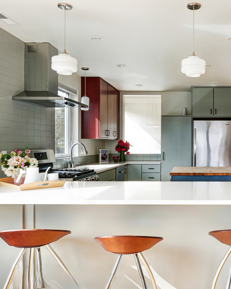 Above, soaring ceilings with exposed trusswork and a wall of windows create a sense of volume and openness, drawing in soft natural light and framing leafy neighborhood views. The kitchen is centered around a generous island and flows seamlessly into the dining and living areas, creating an ideal environment for gathering and connection. Just beyond, a deck extends the living space outdoors, offering an easy transition for dining and relaxation. An outdoor heating element allows for comfortable cold weather enjoyment making the space usable year-round.
