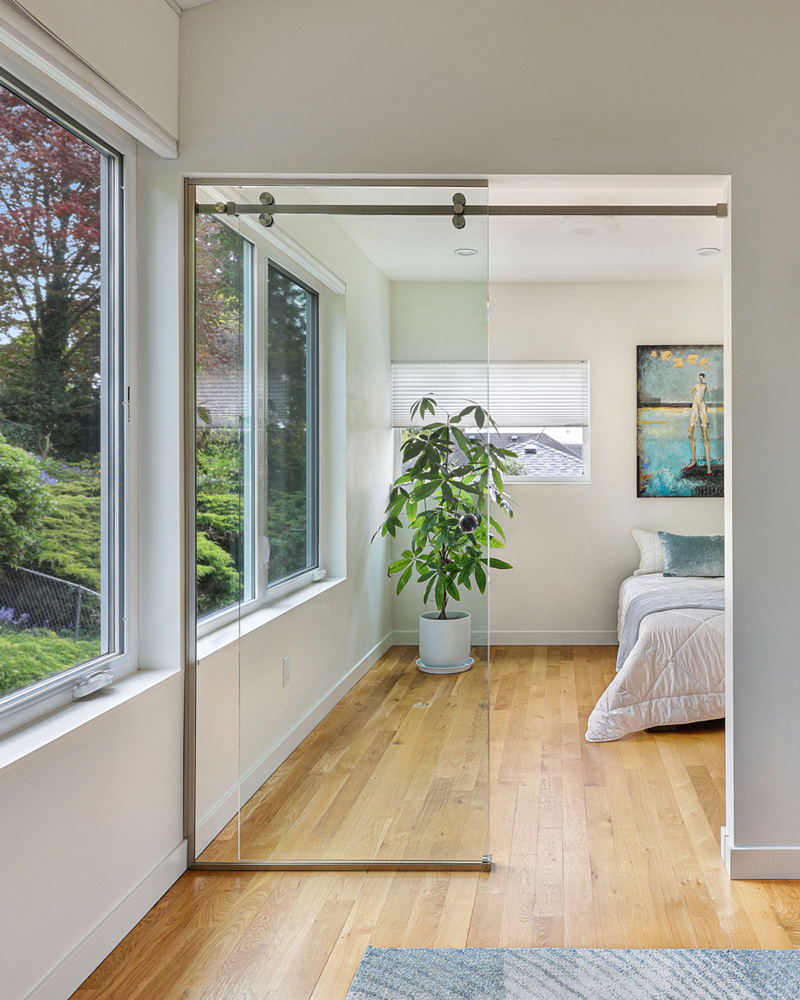 A second room off the main living area functions flexibly as a bedroom or office, where a contemporary glass wall preserves openness while offering separation. A nearby three-quarter bath is finished in cool blue tilework, adding a subtle layer of color and character.