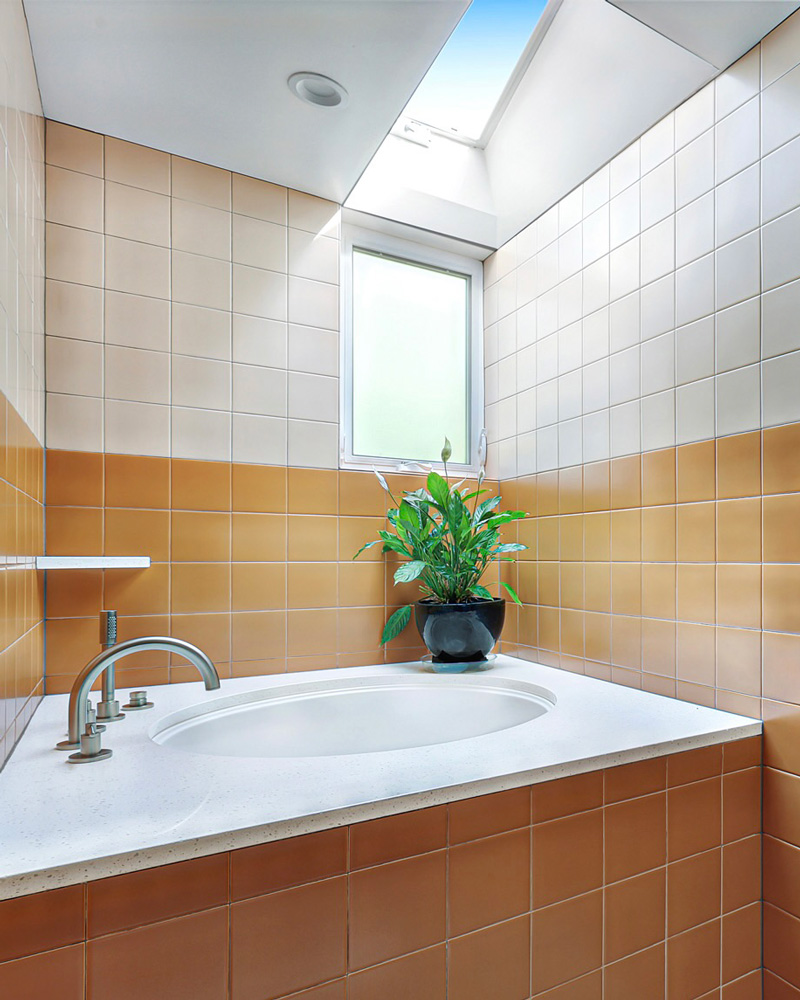 Off the upper landing, the primary bedroom continues the architectural rhythm with open trusses and skylights, bringing in light from above and enhancing the sense of calm. Double closets offer plentiful storage. The ensuite bath is compact yet refined, finished in warm tile with a walk-in shower, Toto Washlet, a beautifully integrated Japanese soaking tub, and concealable stackable washer and dryer.